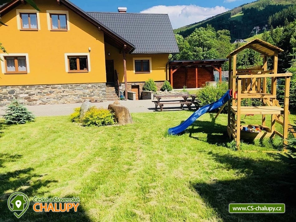 Chalupa Kouty 43 – Kouty nad Desnou – ubytování Jeseníky. Ubytujte se s celou rodinou nebo přáteli v nově zrekonstruované chalupě v Koutech nad Desnou přímo u sjezdovky. K pronájmu je celý objekt s oplocenou zahradou a ubytováním až pro 16 osob. V chalupě KOUTY 43 se nachází: 5 samostatných neprůchozích pokojů z toho jeden velký pokoj určený především pro děti jako herna. Velká nadstandardně vybavená kuchyně včetně myčky, barový stůl, velký obývací pokoj spojený s jídelnou a velkým stolem. Vytápěná uzamykatelná kolárna/lyžárna s vyhříváním na lyžařské boty, prostor pro uskladnění potravin a velká lednice. Venkovní prostorná pergola s velkým grilem, ohniště a spousty her nejen pro děti včetně skluzavky a houpaček. K dispozici je plně vybavená kuchyně, lednice s mrazákem, myčka nádobí, trouba na pečení, mikrovlnná trouba, indukční varná deska, tlakový hrnec, toustovač, topinkovač, pákový pressovač, plastové nádobí pro děti, ponorný mixér apod. V chalupě KOUTY 43 se nachází dvě samostatné toalety a dvě koupelny. Koupelna v přízemí má vanu, a sprchový kout. Koupelna v prvním patře má sprchový kout, pračku a sušičku. Ústřední vytápění celého objektu i lyžárny. Pohodlné soukromé parkování přímo v oploceném objektu. Parkoviště pro 4 – 5 aut. Užijte si krásu přírody a zároveň nepřeberné množství letních i zimních aktivit, které Vám nabízí moderní areál KOUTY. Přijeďte si naplno užít sportovní i volnočasové aktivity, které jsou z naší chalupy doslova na dosah! V zimě či létě – s dětmi, rodinou, nebo partou přátel. Bavit se zde budete za každého počasí. Nejsme “na samotě u lesa”. Jsme v centru všeho dění. V Koutech je stále co dělat a proto si na zábavu nebo sport přijde opravdu každý. V okolí se nachází půjčovna a servis kol a lyží, nový Balanc park a trampolínová věž, několik sjezdovek (večerní lyžování), Černohorské Sedlo, Kareš, běžkařské dráhy, bobové dráhy, dětská lyžařská škola, bowling, Bike park, sjezd na koloběžkách, Dlouhé stráně, Koutecký les, Naučná stezka, Rozhledna na Medvědí hoře, Discgolf, Termály Velké Losiny, ruční papírna a mnohem více.