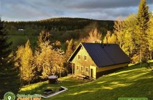 Chalupa Malá Hofmanka – Vítkovice v Krkonoších – venkovní koupací sud. Malá Hofmanka – to je útulná, nově postavená chalupa na krásném a úžasně klidném místě, na polosamotě na stráni u lesa, přímo uprostřed hor. Malá Hofmanka je předposlední chalupou v Zákoutí ve Vítkovicích, u žlutě značené cesty z Vítkovic na Rovinky. Leží ve výšce 760 m, přímo u lesa, s potůčkem tekoucím po hranici pozemku a s výhledem na protější stráně s polosamotami rozesetými nad údolím Hamerského potoka. Chalupa k pronájmu poskytuje ubytování pro až 16 osob v 5 ložnicích: ve 3 ložnicích v podkroví a dalších 2 na půdní galerii je pro vás připraveno až 16 lůžek. V přízemí je: 1 dvojlůžková ložnice (dvojlůžko), 2 čtyřlůžkové ložnice (v každé dvojlůžko a 2 samostatná lůžka) a 2 třílůžkové ložnice na uzavřených půdních galeriích, přístupné z obytného prostoru a z dvojlůžkové ložnice po mlynářských schodech. V každé je dvojlůžko a samostatné lůžko. Můžete si pronajmout pouze některé ložnice, přesto bude chalupa jen pro Vás. V přízemí je dále obytná kuchyně s jídelnou, v podkroví pak ještě společný obývací prostor. Kuchyně je s veškerým nádobím, 2 chladničkami s mrazákem, varnou deskou, 2 rychlovarnými konvicemi, troubou, mikrovlnnou troubou, myčkou nádobí. K dispozici jsou 2 koupelny se sprchovým koutem a WC + další 2 samostatná WC s umyvadlem. Vytápění zajišťují elektrické olejové radiátory a krbová kamna s rozvodem horkého vzduchu. Parkování max. 7 aut u objektu na vlastním pozemku, přístup po štěrkové cestě. V zimě parkování na obecním pozemku 350 m – 2000 m od objektu, podle množství sněhu. U chalupy je samostatnými dveřmi přístupný sklad na lyže, kola a další vybavení hostů. Posezení u stolů, ohniště s lavičkami s výhledem do údolí. Dále dětské pískoviště, klouzačka, houpačka a vyhřívaný koupací sud. Na běžecké tratě mezi Horními Mísečkami a Beneckem je to od nás 700 metrů, k hospodě Rovinka 1 km, po běžeckých tratích na Benecko necelé 4 km a na Horní Mísečky 8 km. A obec Vítkovice, kde je obchod, pošta i půjčovna lyží, je 1,5 km od nás dolů. Krkonoše nejsou jen rušná horská střediska, u nás najdete krásná a tichá místa se vším, co k našim nejvyšším horám patří – výhledy, čistým vzduchem, lesy, stráněmi, potoky a opravdovými zimami. Tady zažijete atmosféru starých Krkonoš, v kterémkoli ročním období, tady zapomenete na ruch dole pod horami. Přímo od chalupy můžete vyjet na běžkách, na kole, nebo vyrazit po svých na mnoho krásných a vyhlášených krkonošských míst, včetně nejvyšších hřebenů. Sem se můžete příjemně unaveni vracet a užívat si dokonalý klid a pohodu.