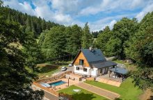 Chalupa na Šanově – Červená Voda – wellness ubytování s finskou saunou ,vyhřívaným bazénem a koupací kádí. Naše chalupa na Šanově se nachází na horním konci malebné obce Šanov, na klidném místě u lesa, naproti vlastnímu rybníčku, na pomezí oblastí Orlické hory a Jeseníky. Nabízíme komfortní ubytování až pro 11 osob, chalupa má čtyři dvoulůžkové pokoje a jeden třílůžkový pokoj. Ve všech pokojích jsou manželské postele. Dva pokoje jsou v přízemí, další tři v patře. V přízemí je samostatné WC, sauna, technická místnost s pračkou a sušičkou, kuchyň spojená s jídelním posezením a s obývákem, krb, sedací souprava a televize. V prvním patře jsou tři pokoje, koupelna a prostorná skříň na chodbě. Na chalupě máme plně vybavenou kuchyň spotřebiči značky Concept: americká lednice s mrazákem, myčka, el. trouba, mikrovlnná trouba, indukční deska, digestoř, varná konvice, kávovar na zrnkovou kávu, toustovač, sendvičovač, ruční mixér, smoothie mixér, robotický vysavač a tyčový vysavač. Wifi připojení pokrývá veškeré vnitřní prostory tak i terasu pod pergolou. Ve všech pokojích jsou manželské postele, skříňky, zrcadlo, věšáková stěna a podlahové vytápění. Pokoje v přízemí mají dřevěnou podlahu a pokoje v 1.patře mají koberce. Na pokojích jsou pro Vás připraveny ručníky a osušky, prostěradla do sauny a samozřejmostí jsou povlečené postele. Součástí chalupy je prostorná finská sauna pro 5 osob, dětská postýlka, přebalovací pult a dětská polohovací židlička. Za nepříznivého počasí oceníte pračku a samostatnou sušičku prádla. Mezi další vybavení patří žehlička a žehlící prkno. Bazén se zastřešením vyhříváme na příjemných 28 stupňů Celsia. U bazénu jsou k dispozici pohodlná lehátka, posezení, houpačka a hračky pro děti. Posezení s krbem pod pergolou s výhledem do krásné přírody je pro Vás připravené za chalupou, v zadní části dvorku, kde budete mít také nachystané dřevo v krbu i zásobu v dřevníku. Součástí venkovního posezení je i gril. Bývalá garáž slouží jako kolárna/lyžárna vybavená stojany na kola a horkovzdušným sušákem na 12 párů bot. Můžete se těšit na posezení u rybníčku s krásným výhledem do přírody v bezprostřední blízkosti chalupy. V rybníku jsou ryby a divoké kačeny. Připravíme pro Vás ohniště včetně prutů na opékání. Mezi nejvíce navštěvovanou oblastí v blízkosti Šanova je resort Dolní Morava, kde můžete zavítat na Stezku v oblacích, kam se dostanete lanovkou, velmi oblíbený je Mamutíkův park pro děti a bobová dráha.