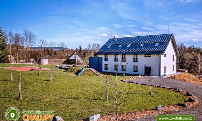 Luxusně vybavená Chalupa Nový Svět s rybníkem, saunou, koupacím sudem a se sportovním a dětským hřištěm se nachází v obci Prostřední Lipka, nedaleko města Králíky, v nádherné krajině pod Králickým Sněžníkem na pomezí Jeseníků a Orlických hor. V těsné blízkosti lze zavítat do celoročně provozovaných areálů Dolní Morava, Červená Voda, Říčky v Orlických Horách a České Petrovice. Chalupa Nový Svět nabízí ubytování pro 31 osob v 14 ložnicích. Po domluvě možnost dalších přistýlek. K dispozici je dětská postýlka. POPIS: V přízemí se nachází vstupní hala s botníky a věšáky. Přes chodbu je k dispozici lyžárna se sušákem na boty a lyžáky a s přímotopným topením na sušení rukavic. Z chodby jsou přístupné 4 apartmány, každý se dvěma ložnicemi (1x manželská postel, 2x samostatné lůžko), zádveřím a sociálním zařízením. Na konci chodby je sauna s výstupem na terasu a samostatnou odpočívárnou. Pod schodištěm je samostatné WC. Po schodišti se dostanete do druhého patra dostanete ke dvěma společným WC, kde jedno je uzpůsobeno pro osoby s omezenou hybností. Děti se mohou v tomto patře těšit na dvoupatrový dětský koutek plný stolních her, molitanových kostek, žíněnek, prolézaček a žebříku do druhého patra. Ke společným chvílím zde slouží jedna velká společenská místnost rozdělená do tří částí. První část je tvořena plně vybavenou kuchyní uzpůsobenou pro vaření pro velkou skupinu osob (2x horkovzdušná trouba, 2x mikrovlnná trouba, 2x sklokeramická deska, 2x dřez, 2x myčka nádobí, kávovar na zrnkovou kávu, topinkovač, toustovač a 4x lednice). U kuchyně je k dispozici samostatná, větraná a nevytápěná spíž. K zapůjčení je také chladící zařízení se čtyřmi naražeči. Na jeden lze zdarma narazit 20l soudek Bernard 11, další sudy jsou za příplatek. V druhé částí místnosti je jídelna, kde jsou umístěny 3 velké, dřevěné stoly variabilně uzpůsobitelné dle vlastní potřeby stolování s celkovou kapacitou 32 židlí. Třetí část slouží jako obývací část a je rozdělena na relax zónu pro dospělé, kde je k dispozici velkoplošná TV připojená k wi – fi, SKYLINK, TV anténa, tři dvousedačkové pohovky, dva sedáky, DVD přehrávač a na relax zónu pro děti, pro které je k dispozici velkoplošná TV, připojená k wi – fi, SKYLINK, TV anténě, herní konzole X – Box Kinect 360 s hrami a konzole PlayStation PS3 s hrami, projektor s plátnem a tři dvousedačkové gauče. Zahrát si lze také stolní fotbal. Ze společenské místnosti je přístupná terasa se dvěma stoly a 12 křesly, venkovním plynovým grilem Campingaz woody LX, elektrickou udírnou KAISEROVA „60“. Z této terasy se lze dostat po venkovním schodišti na spodní terasu před wellness a k venkovnímu koupacímu sudu pro 8 osob. Ve třetím se nachází 3 – lůžkový pokoj s vlastním sociálním zařízením., jeden 5 – lůžkový pokoj se dvěma ložnicemi (1x manželská postel, 3 samostatná lůžka), předsíňkou a samostatným sociálním zařízením a jeden 7 – lůžkový pokoj třemi ložnicemi (2x manželská postel, 3x samostatné lůžko) velkou předsíňkou a sociálním zařízením uzpůsobeným pro osobu s omezenou hybností. V předsíni se nachází pračka. Také je zde vstup do dětského koutku. Sociální zařízení zahrnuje celkem 7 koupelen a 11 WC. Součástí každé koupelny je WC, sprchový kout, umyvadlo se skříňkou, zrcadlo, odvětrání a horkovodní žebřík. Vytápění je řešeno v přízemí podlahovým vytápěním se samostatnými termostaty pro každou místnost. Ve třetím patře jsou přímotopy. V každé koupelně je teplovodní žebřík. Pro všechny ubytované jsou součástí areálu upravené hřiště s umělým povrchem a stožáry na volejbal a nohejbal. Fotbalové brány, síť a balóny jsou zdarma k zapůjčení. Pro děti jsou k dispozici herní prvky (prolézačky, pískoviště, atd….). Dostatek pohybuje zajistí také bezpečný Pumptrack se klopenými zatáčkami a skoky. V letních měsících se můžete těšit na plody ovocných stromů z našeho sadu (jabloně, hrušně a třešně). Posedět lze u ohniště. Parkovat lze přímo u objektu, k dispozici jsou dvě parkoviště s kapacitou 15 osobních vozů. V okolí objektu možnost turistiky, cykloturistiky, koupání, houbaření, rybaření, běžkování a lyžování. V blízkosti je také jízdárna. Mezi možnosti koupání patří např.: Velké Losiny – termály, koupaliště Králíky, bazén Mezilesí, Hynčice pod Sušinou – rybník Úžas, koupaliště Jablonné nad Orlicí, přehrada Pastviny, Štíty – Acrobat Park, atd. V zimním období jsou k dispozici lyžařská střediska: : Dolní Morava – Sněžník, Dolní Morava – Větrný vrch, Šanov, Mladkov – Petrovičky a další. V okolí k výletům láká Stezka v oblacích Dolní Morava, Tvrz Hůrka, Vojenské muzeum Králíky, Poutní areál Hora Matky Boží v Dolní Hedeči, Rozhledna na Křížové hoře, Suchý vrch, Přírodní park Zemská brána v Klášterci nad Orlicí nebo Přírodní rezervace Králický Sněžník s pramenem řeky Moravy. Těšíme se na Vás u nás.
