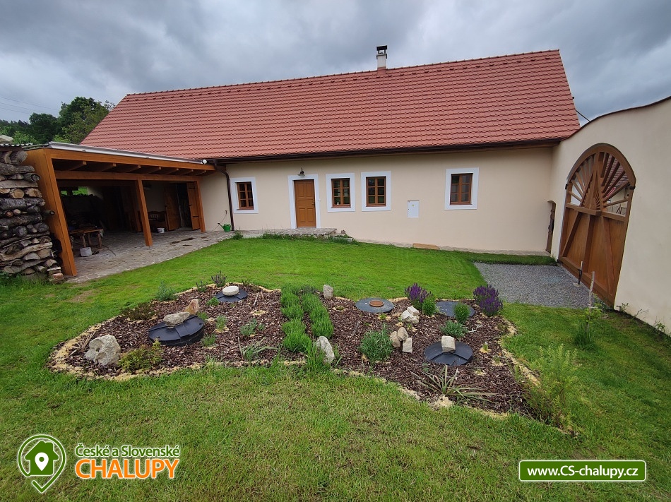 Stylová Chalupa U Dudáčků se saunou se nachází v pošumavské obci Zechovice, zasazené do nádherné kopcovité a lesnaté krajiny s množstvím výhledů na okolní přírodní krásy. Blízké i vzdálenější okolí Vám nabízí nepřeberné množství sportovních a zážitkových akcí ve všech ročních obdobích. Nedaleko lze navštívit města Volyně, Strakonice a Vimperk. Chalupa pro svoji historii patří do vesnické památkové zóny. Těšit se tak můžete na udržitelné ubytování ve venkovském stylu v náručí přírody, v naprostém klidu a pohodlí, ale s vymoženostmi moderní doby. Chalupa U Dudáčků s bezbariérovým přístupem poskytuje ubytování pro 10 osob, celkem je k dispozici 7 pevných lůžek a tři přistýlky. Chalupa má jedno podlaží, sklep a je velmi komfortně vybavená. K dispozici jsou dvě čtyřlůžkové ložnice, jedna s manželskou a patrovou postelí a druhá s manželskou a rozkládací postelí. Pro společné chvíle slouží kuchyň s jídelním prostorem, kachlovými kamny a obývacím koutem s TV a rozkládací pohovkou sloužící jako přistýlka pro dvě osoby. Kuchyň je plně vybavená, k dispozici je indukční varná deska, elektrická pečící trouba, myčka, lednička s mrazákem, konvice, kávovar, mlýnek na zrnkovou kávu a ponorný mixér s širokým příslušenstvím. Využívat lze také pračku, žehličku a vysavač. Na společné prostory navazuje koupelna s WC, vanou, sprchovým koutem a saunou pro 4-5 osob. Za kuchyní se nachází další samostatné WC. Vytápění je řešeno elektrickými přímotopy, ale pro dokreslení atmosféry si lze zatopit v kachlových kamnech na dřevo s prohřívanou lavicí. Pro komfortní vnitřní klima slouží rekuperace pro větrání. Chalupa je téměř soběstačná, využívá vlastní vyrobenou elektrickou energii z fotovoltaického systému a zachycenou dešťovou vodu pro splachování obou WC. Pitná voda je z veřejného zdroje. Odpadní vody se přečišťují biologickým filtrováním jsou dále spotřebovávány k zálivce zahrady. V celém objektu je k dispozici WIFI připojení na internet. Zastřešený prostor vedle chalupy slouží pro parkování 2 osobních aut a stání obsahuje 1 nabíjecí stanici pro elektromobily. Tento prostor můžete využít také jako kryté posezení s přenosným elektrickým grilem. Pro odpočinek v zahradě jsou k dispozici polohovatelná lehátka, ze kterých si lze užívat výhledy na přírodní památku „Na opukách“ – návrší jihovýchodně od vesnice. Pro děti je na zahradě připravená houpačka. Přilehlá uzamykatelná dílna slouží jako úschovna kol a lyží. V okolí objektu možnost turistiky, cykloturistiky, koupání, houbaření, rybaření, běžkování a lyžování. V blízkosti je také jízdárna. Mezi možnosti koupání patří např.: Přírodní plovárna Volyně, bazén Strakonice, koupaliště Vimperk atd. V zimním období jsou k dispozici blízká lyžařská střediska: Lyžařský areál Zadov, LA Kubova Huť, SKI areál Nové Hutě nebo SKI areál Kašperské Hory. K výletům v okolí láká Chráněné území a Přírodní památka Na opukách, Naučná stezka Selské baroko, Machův včelín v Krušlově, rodný dům Mistra Jana Husa v nedaleké obci Husinec, Hoštice u Volyně, kde se natáčely některé scény z trilogie „Slunce, seno“, Kubova Huť (995 m n. m.) – nejvýše položená železniční stanice v ČR, Boubínský prales a další. Těšíme se na Vás.