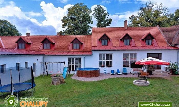 Ubytování u Halešů – chalupa Libořezy s bazénem – Stříbřec. Nabízíme pronájem chalupy pro až 21 osob 1 skupině klientů v soukromí. Jedná se o zcela uzavřenou usedlost s velkým zatravněným dvorem a bazénem. K dispozici je také herna a krbová (společenská) místnost s televizí. Součástí dvora je zastřešené posezení v bývalé stodole s výčepním zařízením. V přízemní hale pod schodištěm se nachází plně vybavená kuchyně (americká lednice s ledovačem, myčka, sporák, mikrovlnná trouba, rychlovarná konvice, nádobí, pressovač, žehlička…), jídelní stůl s lavicemi a dětskou židličkou. V sousední společenské místnosti najdete velký krb, stoly a lavice, televizor, stolní fotbálek, šipky a ping-pongový stůl. V přízemí je i WC. V patře naleznete schodišťovou podestu se sedací soupravou se stolkem a herním koutkem pro děti. Součástí vybavení je i 1 dětská postýlka. Pokoje se nacházejí v podkroví s okny do tichého a klidného dvora. K dispozici jsou 2 koupelny (sprchový kout + umyvadlo) a 4 WC. Pokoj č. 1 – 2 lůžka, pokoj č. 2 – 3 lůžka, pokoj č. 3 – 4 lůžka, pokoj č. 4 – 4 lůžka + možnost 2 přistýlek, pokoj č. 5 – 4 lůžka + možnost 2 přistýlek. Vše je vybaveno lůžkovinami (deka + polštář) a povlečením. Zatravněný dvůr je vhodný k míčovým hrám i klidnému posezení na čerstvém vzduchu. Hostům je k dispozici ohniště s roštem na grilování, pískoviště s hračkami, houpačky se skluzavkou a trampolína. Součástí dvora je i uzamykatelná úschovna kol. Další ohniště se nachází v otevřené stodole, kde jsou i ruské kuželky. Ke grilování je k dispozici grilovací nářadí, jehly na opékání klobás, nerezová nádoba, azbestové rukavice. Auta lze zaparkovat přímo v uzamykatelném dvoře. Chalupa se nachází v obci Libořezy v CHKO Třeboňsko na křižovatce silnic (II/153 a 1536) a cyklostezek mezi Třeboní (15 km), Chlumem u Třeboně (8 km) a Jindřichovým Hradcem (15 km). Další možnosti koupání v blízkém okolí mimo náš bazén: rybník Nový Stříbřecký, Staňkovský rybník, Novomlýnský rybník – Peršlák, rybník Hejtman, Velký Hatínský rybník, rybník Blanko, Pěnenský rybník – Dřevo nebo např. rybník Rožmberk.