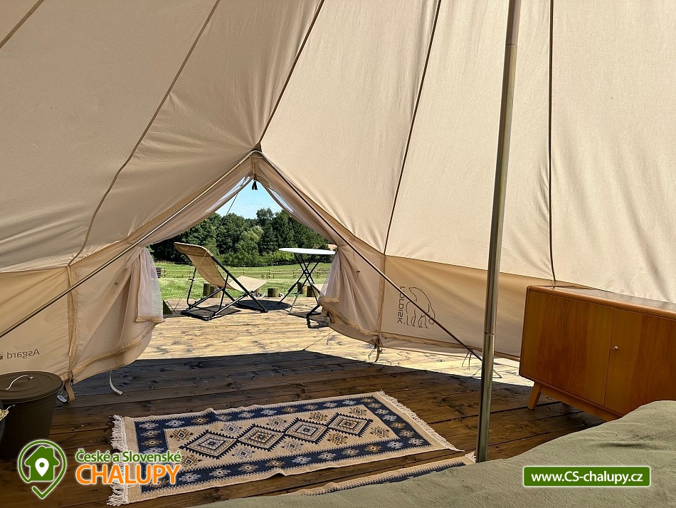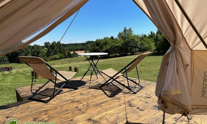 Glamping Návary – ubytování Česká Kanada. Glampingový stan je umístěn na kopci s výhledem na ohradu s koňmi a celé okolí vesničky Návary. Je umístěn 300 m o Návarského rybníku, kde je překrásné koupání s pozvolným stupem do vody. Ubytování nabízíme v okrouhlém glampingovém stanu 19m2, který je umístěn na 35m2 dřevěné podestě, 10 m od stanu je umístěna letní kuchyně s obývacím prostorem o velikosti 24 m2, kde je umístěna kuchyňská linka s plnohodnotným vařením na plynovém sporáku, barové posezení a kanape. Vedle posezení je umístěna koupelna s bojlerem na teplou vodu. Suché WC je umístěno ve stromoví 20 m od stanu. Dále máme 2 podestové stany, kdy každý ubytuje 2 osoby na postelích o velikosti 70×200. V glampingovém stanu se nachází manželská postel 160 x 200, stylová komoda na oblečení, křeslo, noční stolky s lampičkami na čtení a koberce pro pohodlí. Před stanem je venkovní stůl s křesly a výhledem na ohradu s koňmi a okolní louky. V obývacím prostoru je sedací kanape (rozkládací), barový stůl s barovými židlemi a plnohodnotná kuchyně s plynovým sporákem, lednicí, troubou a teplou vodou na mytí nádobí. Venkovní koupelna je obložená rustikálními laťkami a obsahuje prostorný sprchový kout. V glampingu je možno využívat neomezené WI-FI připojení a 220V. V okolí je možná cyklistika, rybaření v okolních rybnících, koupání v Návarském rybníku nebo na Filipově, prohlídka hradu Landštejn, prohlídka Slavonic (UNESCO), malování hrnků (Slavonice, Maříž), Minipivovar Český Rudolec, hrad a zámek Jindřichův Hradec, aquapark Jindřichův Hradec, Farma s bizony a steaky z nich Rožnov, zámek Dačice, zámek Telč, cyklostezky po okolí, pivovar Nová Bystřice, thajské masáže v Nové Bystřici nebo např. rybník Osika. Nejbližší hospoda je dole ve vsi, další ve Starém Městě, kde i vaří případně v Nové Bystřici. Těšíme se na Vás u nás.