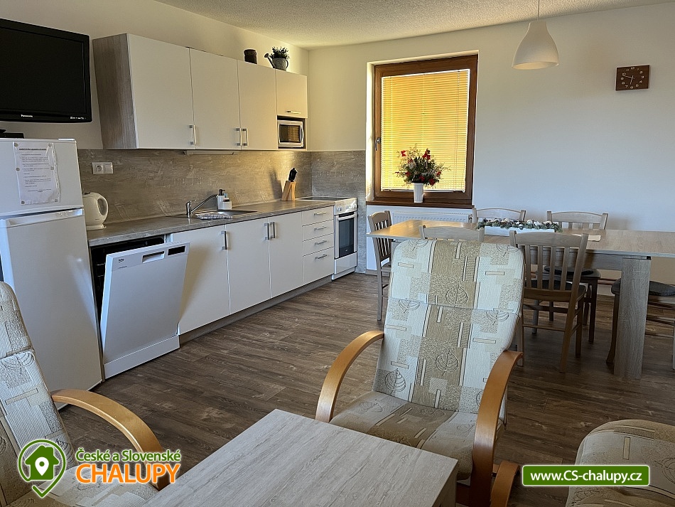 V přízemí: kuchyň s vybavením, TV, satelit, wifi připojení na internet, WC se sprchovým koutem