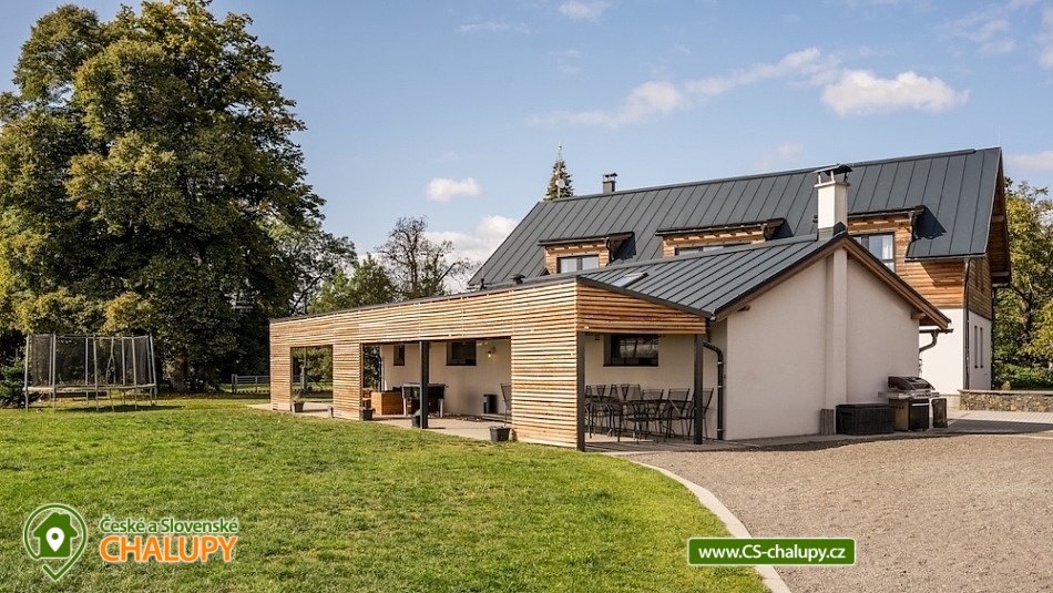 Relax zone Vrchovina – prázdninový dům nedaleko zámku Sychrov s bazénem a saunou. Nabízíme pronájem novostavby pro až 25 osob, která se pronajímá vždy skupině klientů v soukromí. Objekt je rozdělen do několika funkčních celků: ubytovací část tvoří apartmány, které jsou stylově zařízené, prostorné, postele velké, čisté a pohodlné, s podlahovým vytápěním, takže je všude sucho a teplo. K dispozici je 5 apartmánů pro 1x3os., 2x4os., 1x6os. a 1x8os, Každá rodina nebo skupinka 3 až 8 osob má k dispozici vlastní sociální zázemí (sprcha nebo vana) s minimalistickou kuchyňkou. Druhá část je velká společná jídelna s krbovými kamny, měkkými sedacími lavicemi, smart TV, dětským koutkem, klavírem a velkou poloprofesionální kuchyní oddělenou jen barovým pultem, kde je k dispozici profi pípa s 5 kohouty a chlazením. K jídelně jsou samostatná wc. Prostor je oddělen od ubytovací části chodbou – to aby se „sovy a skřivani“ vzájemně nerušili. Jídelnu obklopují venkovní terasy s posezením pod střechou. K dispozici je kvalitní kávovar s vlastní obsluhou a profi pípa na nápoje s 5 kohouty a chladícím zařízením. Použít můžete také prádelnu a bezplatné připojení k internetu. Jen pár metrů od hlavní budovy je v samostatném objektu sauna se sprchou a odpočívárnou a v těsné blízkosti je venkovní bazén se slanou vodou a terasou s lehátky. V rámci oploceného pozemku máte k dispozici rovněž velkokapacitní ohniště s dostatkem dřeva a dětské hřiště s houpačkami a skluzavkami. Nově nabízíme univerzální halu 100m2 – hernu s vlastním sociálním vybavením, kde je ping – pongový stůl, může zde probíhat i společenská akce, cvičení, školení apod. Pozemky okolo areálu jsou našim hostům plně k dispozici vč. vstupu na naši rozhlednu, ze které je krásně vidět například Ještěd, Trosky a nebo hrad Bezděz. Příjezd je bezproblémový i v zimě. Parkování je na vlastním pozemku za zavřenými vraty s kamerovým dohledem. Výhodou obce je její naprostý klid, ze zahrady je vidět dominanta severních Čech – Ještěd 1012 nm, v dálce pak siluety Trosek a Bezdězu. Tipy na výlety: bobová dráha Javorník, zimní stadion, pronájem lodí nebo koloběžek, liberecká ZOO, aquapark Liberec, IQ Landia, paragliding, letiště nejen pro větroně, golf a malebná příroda Českého ráje – všude kolem. Krátkou procházkou se od nás můžete zajít podívat například na Hodkovické letiště, k řece Mohelce, na státní zámek Sychrov a nebo můžete jen obejít naši klidnou obec a potkat pár srnek. Ze vzdálenějších míst s dojezdem 15minut můžeme vyjmenovat Malou Skálu, Frýdštejn, volnočasové středisko Javorník, přírodu Českého ráje, koupaliště přírodní i krytá, nebo zimní stadion v Turnově a samozřejmě Ještěd a lákadla Liberce.