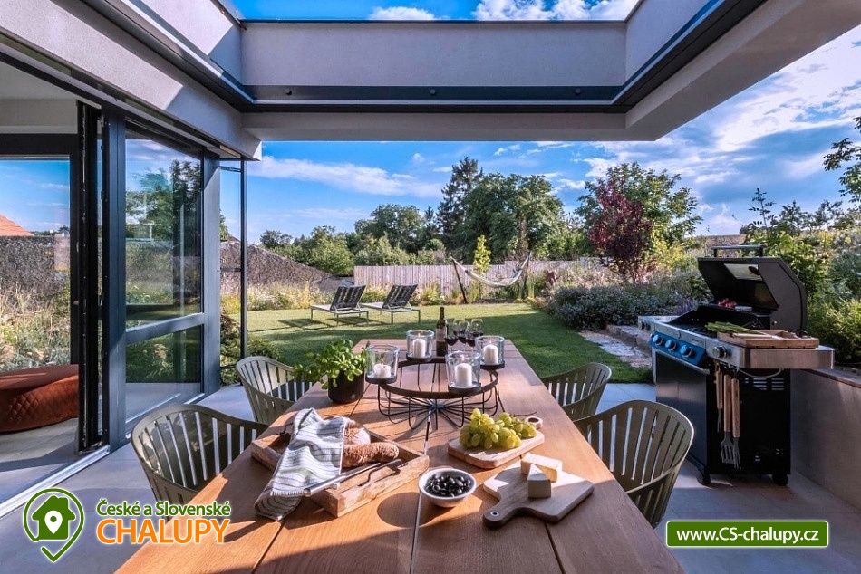 Luxusní Vila K Vechtru s wellness se nachází v obci v obci Kozolupy – Vysoký Újezd v překrásném prostředí Chráněné krajinné oblasti Český kras. Pro svou ideální lokalitu nabízí spoustu možností pro aktivně strávený čas nebo jen odpočinek v každém ročním období. Mezi nejbližší a nejatraktivnější turistické cíle patří lom Velká Amerika a Hrad Karlštejn. Luxusní vila vás okouzlí svým soukromým wellness, kde můžete neomezeně odpočívat ve finské sauně nebo ve vnitřním bazénu s protiproudem, ze kterého je přímý vstup na terasu a díky panoramatickým oknům z něho máte výhled do krásné zahrady. Moderní, nadstandardně vybavená vila K Vechtru poskytuje ubytování pro 14 osob v šesti dvoulůžkových ložnicích ve vile a v jednom dvoulůžkovém apartmánu ve stodole. Tento samostatný apartmán má plně vybavenou kuchyň (trouba, myčka, indukční deska, lednice), malou jídelnu, ložnici s kvalitní manželskou postelí a sedačkou, koupelnu se sprchovým koutem a samostatným WC. Apartmán je vhodný pro návštěvníky preferující větší soukromí. Vila má v podkroví k dispozici dvě prostorné ložnice s velkou manželskou postelí, třímístnou a dvoumístnou sedačkou. Dále je zde společenská místnost se sedací soupravou, stolkem, lampou a TV. V přízemí jsou tři ložnice s velkou manželskou postelí a jedna ložnice se dvěma jednolůžkovými postelemi. Dětská postýlka je k zapůjčení. Pro klidný spánek a větší soukromí má každá ložnice venkovní žaluzie. Lůžka mají kvalitní a tvrdou matraci včetně kvalitních lůžkovin. Ve všech ložnicích je k dispozici křeslo, lampa, komoda, stolek a držák na ručníky. Pro každého ubytovaného jsou připraveny 2 polštáře, deka, kvalitní povlečení, 1 ručník a 2 osušky – jedna z nich je určena na bazén či saunu. V přízemí se také nachází nadstandardně vybavená kuchyň (myčka, ostrůvek s indukční deskou, trouba, mikrovlnka, varná konvice, automatický kávovar mlýnek na kávu a mléčným systémem, skleničky na bílé a červené víno, šampusky, skleničky na tvrdý alkohol a pivo, talířky, příbory, struhadlo, kuchyňská váha, utěrky, pánve, hrnce, mísy na saláty, formy na pečení, konvice na čaj, toustovač, ponorný mixér, atd.), dále jídelna s posezením pro 12 osob. Na kuchyň navazuje obývací prostor s koženou sedačkou, stolkem, taburetem, společenskými hrami a TV. Z obývacího pokoje lze vstoupit na zastřešenou terasu. V celém objektu je WIFI připojení na internet. K dispozici je také technická místnost s pračkou, sušičkou, žehlícím prknem, žehličkou, sušákem, mopem, vysavačem a fénem. Sociální zařízení vily zahrnuje v podkroví 1x koupelnu se sprchovým koutem a WC a v přízemí 1x koupelnu se sprchovým koutem a WC, 1x koupelnu se sprchovým koutem, vanou a WC a 1x samostatné WC. Vytápění je řešeno topnými fóliemi. Kolem vily se rozléhá krásná okrasná zahrada. Venku lze posedět na zastřešené terase s grilem a posezením pro 12 osob. Dále je velká terasa u stodoly. V prostoru zahrady jsou rozmístěné pro odpočinek lavičky a křesílka a houpací síť (hamak). K dispozici je také ohniště. Parkovat lze v zastřešené garáži pro 4 osobní auta nebo před garáží. V okolí vily možnost turistiky, cykloturistiky, koupání, houbaření a rybaření. V blízkosti je také golfové hřiště, jízdárna a tenisové kurty. Okolní lesy jsou krásné pro procházky nebo běh v terénu. Mezi možnosti koupání patří např.: aquapark Beroun, Mirešický rybník, koupaliště Beroun, rybník Bašta, Lom Homolák, koupaliště Biotop Radotín, vodní nádrž Vrané, aquapark Barrandov, koupaliště Koupaliště Šárka, koupaliště Džbán, koupaliště Zdic, atd. K výletům láká Svatý Ján pod Skalou, Solvayovy lomy, Koněpruské jeskyně, Srbsko, Chrustenická šachta, Dobřichovice, historický Tetín, Křivoklát, hrad Krakovec, zámek Zbiroh, Hrad Točník a Žebrák, město Beroun a hlavní město Praha. Těšíme se na Vás u nás.