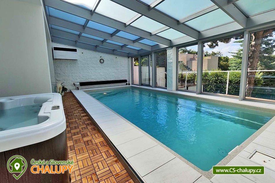 Vila Prag – Praha Hlubočepy – vnitřní bazén a vířivka. Nabízíme pronájem komfortní vily na klidném místě pro až 32 osob v celkem 11 ložnicích. Vilu Prag najdete v hlavním městě Praha v městské části Hlubočepy, jen 3,8 km od Vyšehradu a 600 m od Filmových ateliérů Barrandov. V objektu je prostorný obývací pokoj s TV a výhledem do zahrady. Plně vybavená kuchyně je včetně myčky na nádobí. V objektu je 6x 2-lůžková ložnice a 5x ložnice se 4 lůžky. Ve vile se nachází celkem 3 koupelny s WC. Parkoviště u objektu je soukromé a neplacené. Vila Prag se nachází na konci slepé ulice Pod Habrovou ve velmi klidné části Barrandova. K dispozici je soukromý bazén se slanou vodou, vířivka a zahrada s grilem. Velmi pěkná je sluneční terasa k posezení. Vila je obklopena lesem, který poskytuje naprostý klid a soukromí. Přitom do centra na Národní třídu se autem dostanete do deseti minut a městskou hromadnou dopravou do 20 minut. V létě je možnost v naprostém soukromí posedět v atriu u venkovního krbu a kochat se pohledem na velkou zahradu lesoparkového stylu o rozměrech 3 000 m2. Vila je vhodná pro ubytování manažerů, pořádání eventů, ale stejně tak i pro ubytování skupin zahraničních turistů, nebo pro rodinnou dovolenou. Vyžití, atrakce a výlety nabízí hlavní město Praha. Pro milovníky golfu je Golf & Country Club Hodkovičky vzdálen pouhé 3 kilometry. V tomto areálu naleznete také tenisové kurty a další sportovní vyžití. Nejvýznamnější pražské památky, jako je například Karlův most nebo Národní muzeum se nachází jen 6 km od naší vily.