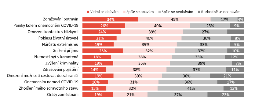 Na prvním místě je zcela jistě hrozba výpadku příjmů a také zdražování potravin. Obává se ji až 79 % respondentů. Paniky se obává 66 % respondentů a omezení kontaktu s blízkými 63 %. Poměrně zajímavá jsou také čísla týkající se strachu z nakažení a onemocnění Covidem-19. Obavy projevila necelá polovina dotazovaných lidí.